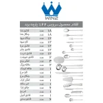 - تعداد اقلام: قاشق غذاخوری: 18 عدد، چنگال غذاخوری: 18 عدد، کاردغذا: 6 عدد، کارد میوه خوری: 12 عدد، چنگال میوه خوری: 12 عدد، قاشق مربا خوری: 12 عدد، قاشق چای خوری: 12 عدد، قاشق شربت: 12 عدد، قاشق خورشت: 2 عدد، کفگیر: 3 عدد، ملاقه بزرگ: 2 عدد، ملاقه کوچک: 1 عدد، کارد مرغ: 1 عدد، چنگال مرغ: 1 عدد، کفگیر کیک: 1 عدد، قاشق بستنی: 6 عدد، انبرسالاد: 1 عدد، قاشق آجیل: 1 عدد