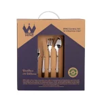 - تعداد اقلام: قاشق غذاخوری: 6 عدد، چنگال غذاخوری: 6 عدد، کارد میوهخوری: 6 عدد، چنگال میوهخوری: 6 عدد، قاشق مربا خوری: 6 عدد، کفگیر: 1 عدد، ملاقه بزرگ: 1 عدد، ملاقه کوچک: 1 عدد